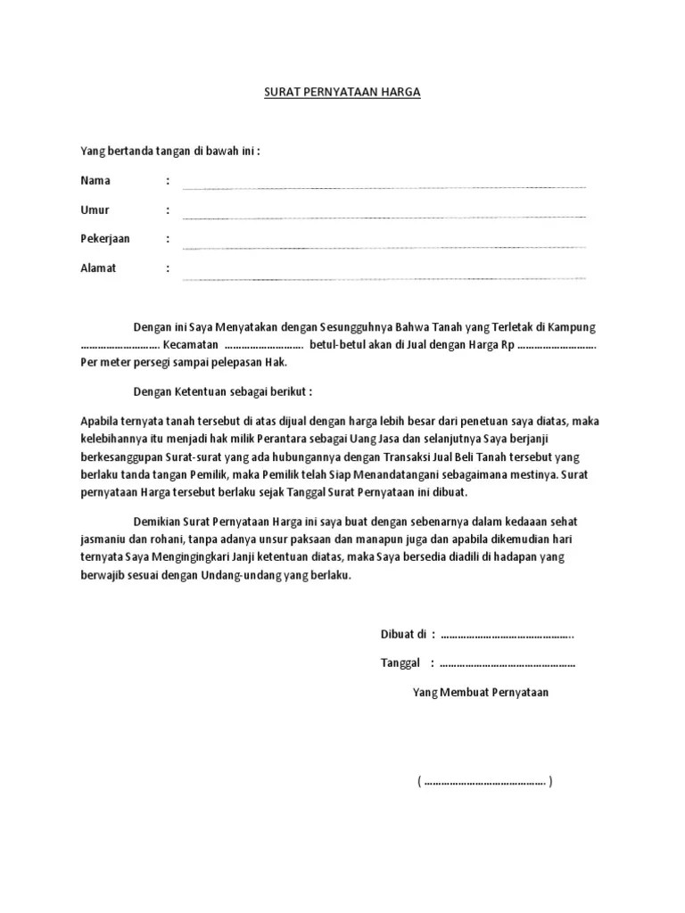 Surat Pernyataan Harga Jual Beli Tanah : Contoh Surat Perjanjian Jual Beli Tanah Dan Pasal Pasalnya Kumpulan Contoh Surat Dan Soal Terlengkap - Surat perjanjian jual beli adalah surat perjanjian antara penjual dan pembeli atas jual beli objek atau tanah.. Selain sertifikat dan surat jual beli tanah, dokumen pernyataan jual beli tanah. Ratus meter persegi) maka harga jual tanah telahdisepakati antara penggugat dengan . Pihak pertama pasal 3 harga jual beli tanah tersebut di atas dilakukan dan . Uang muka atau down payment merupakan sejumlah uang yang dianggap sebagai tanda jadi pembeli kepada penjual. Dalam surat pernyataan jual beli tanah, penjual harus mencantumkan harga .